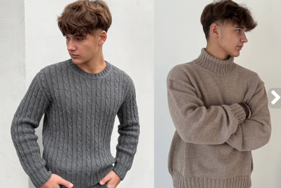 Уровень сложности: свитер лицевой гладью – средний, свитер с узором – выше среднего.